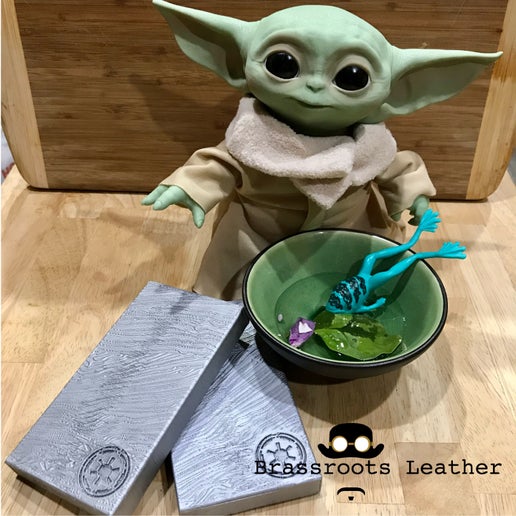 A 3D printed and prop of Beskar made from PLA and painted sterling silver.