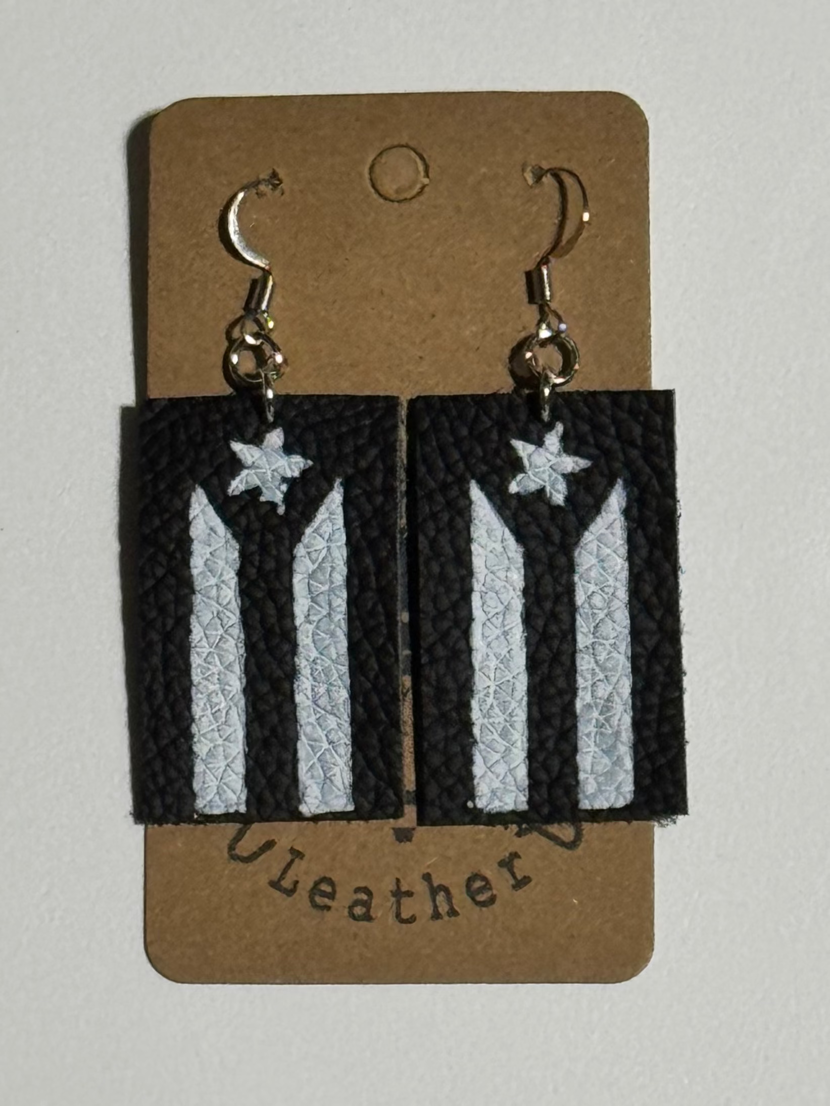 Black leather earring with hand painted flag of Puerto Rico in the black and white style. Measuring 1” x 1.5”. Chrome hardware.