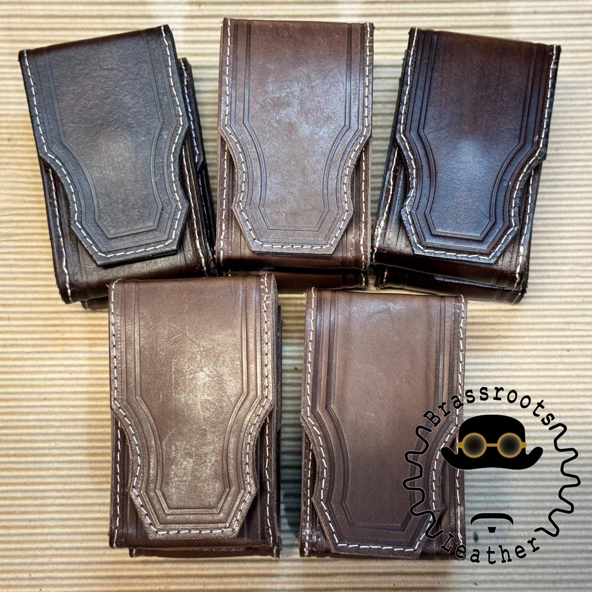 Dark brown leather cases sized 2 9/16” [65mm] by 4 3/16” [106mm] with white stitching all around. A strap on the back that allows for a 2” belt to pass through. The closer is a magnetic snap. Sold as a set of two.