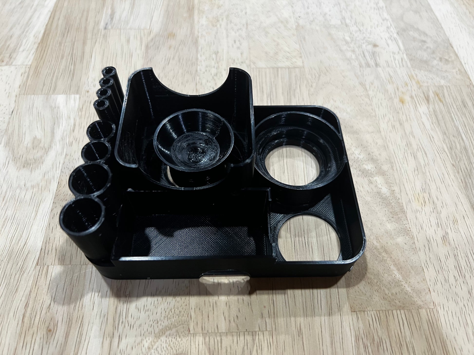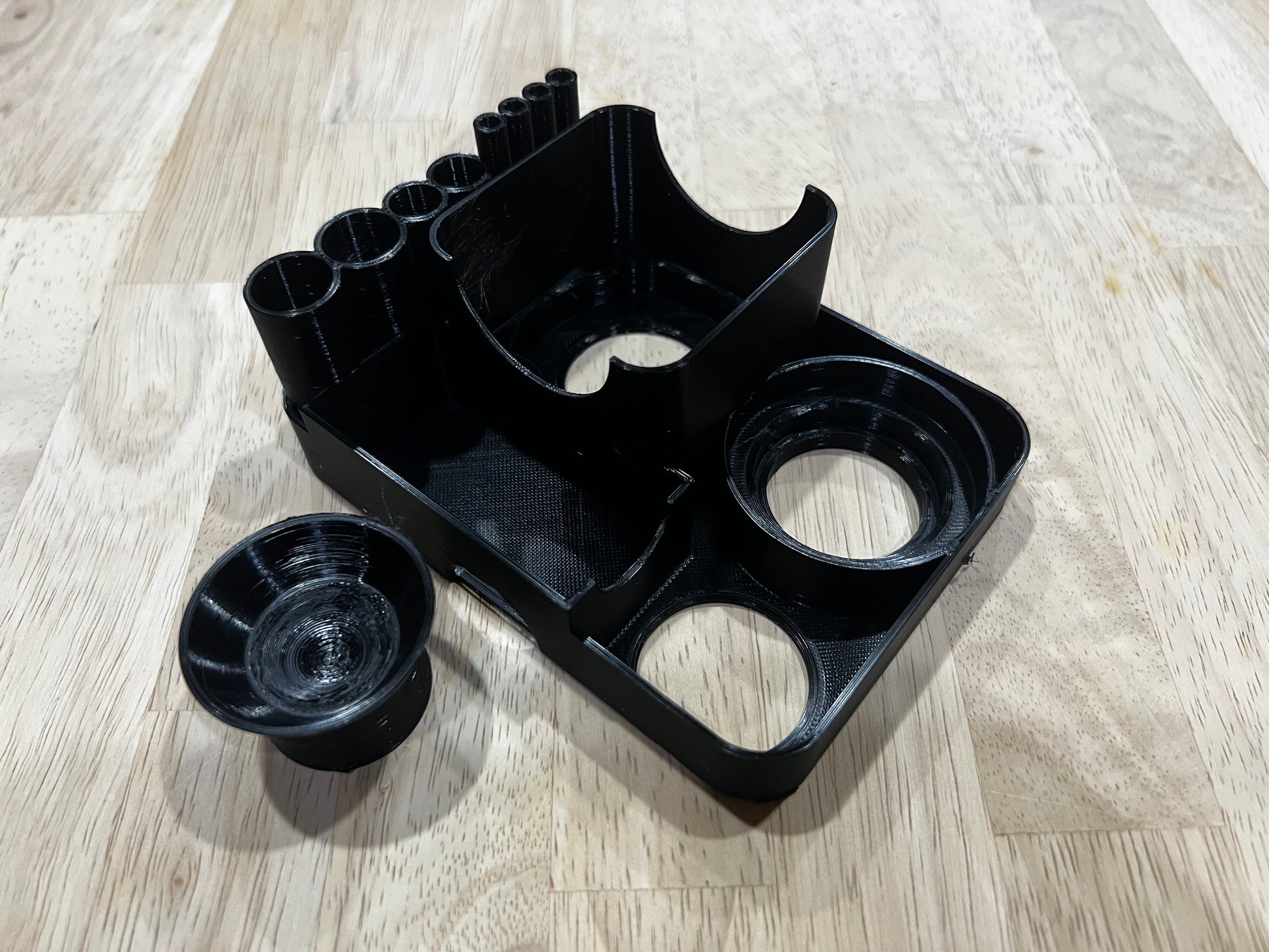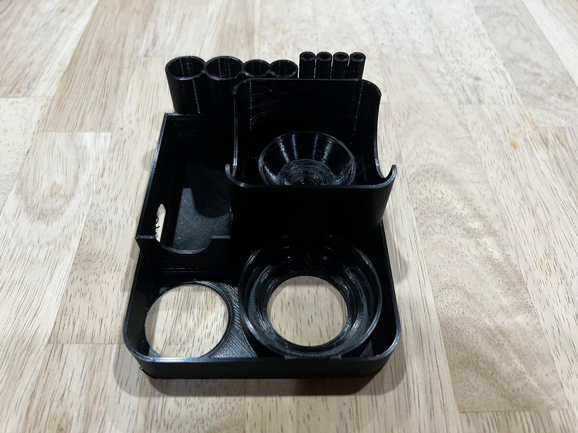 This is a downloadable stl file I have designed that can hold any of the regular sized Tandy leather bottles, their cap, brushes and sponge, and can be printed with a small cup. Recommend using aluminum foil on the cup to prevent staining and cross contamination. If more than one is printed, they should lock together.