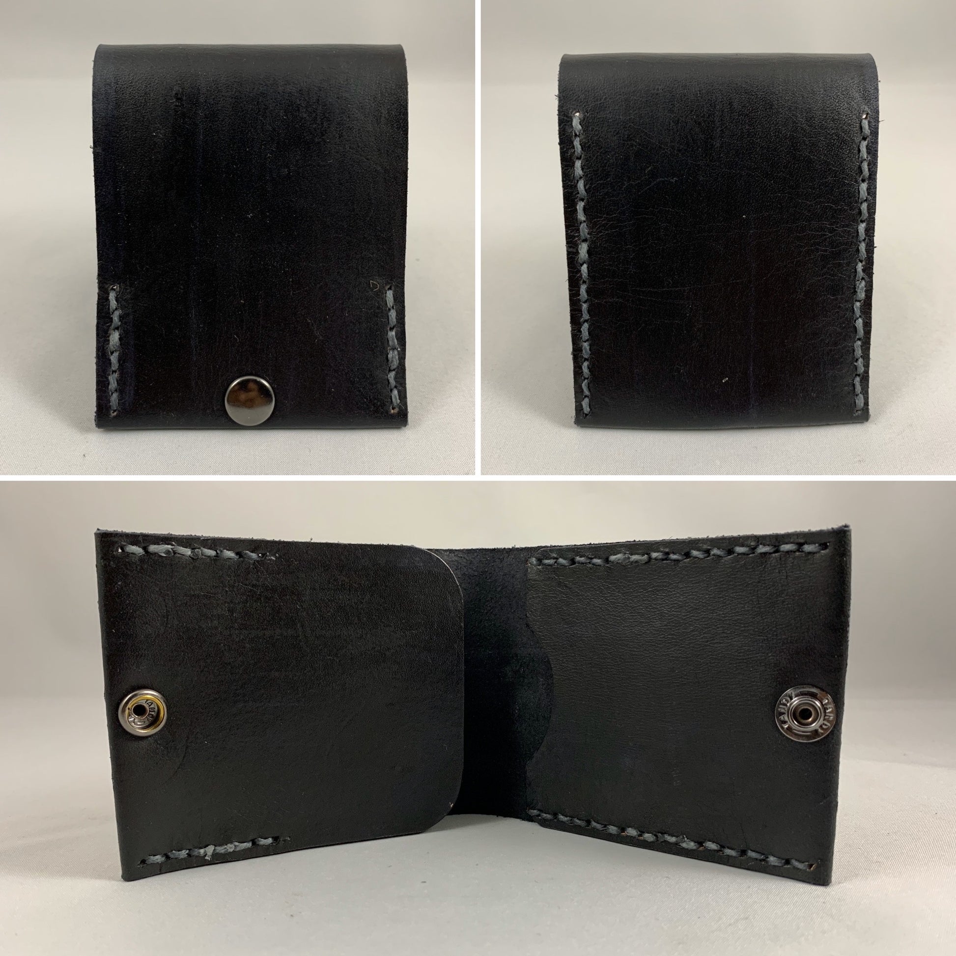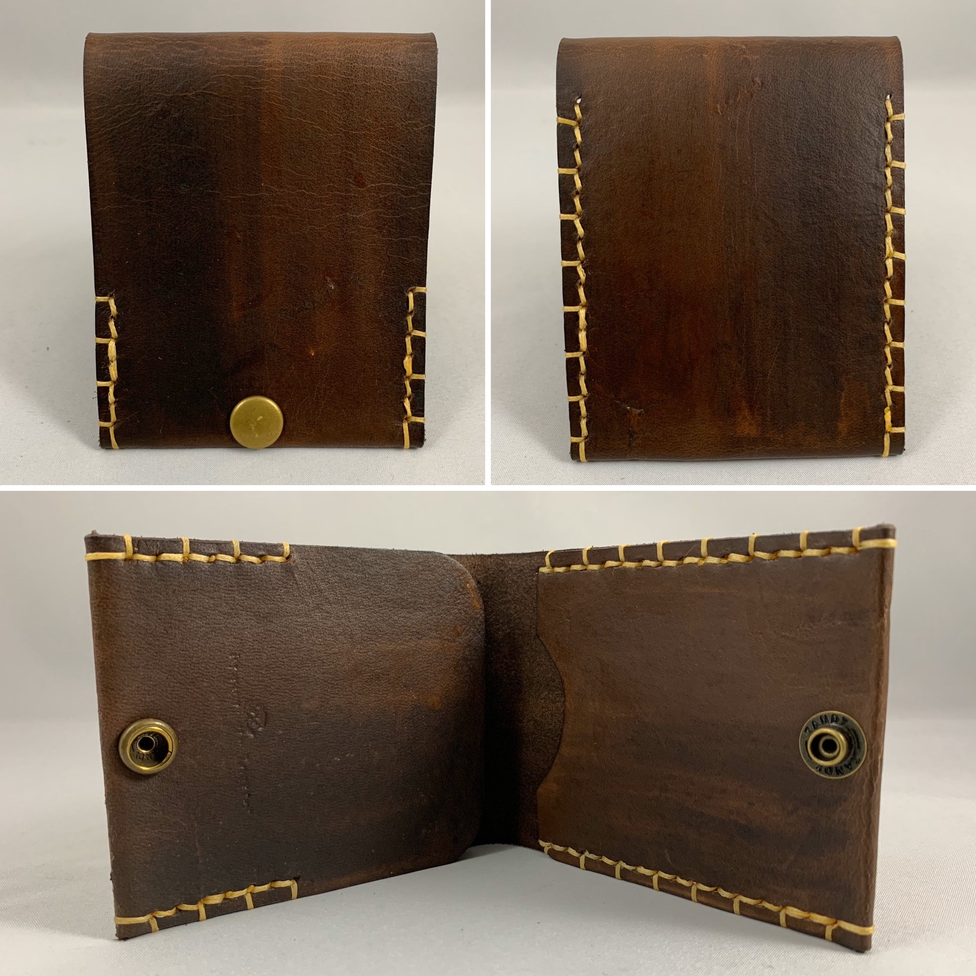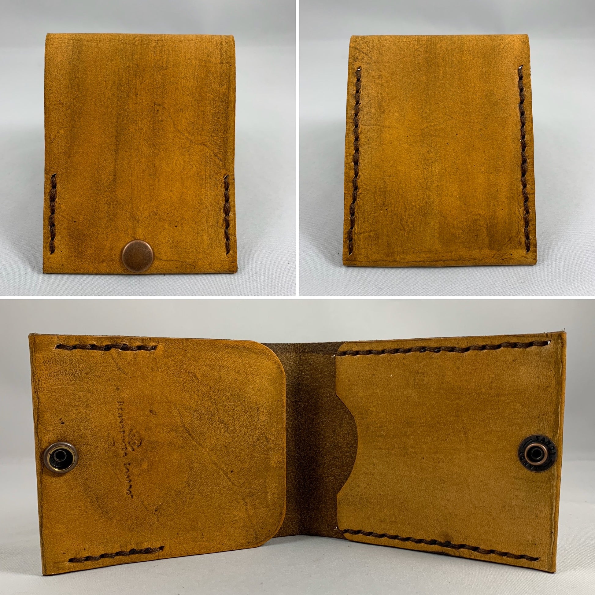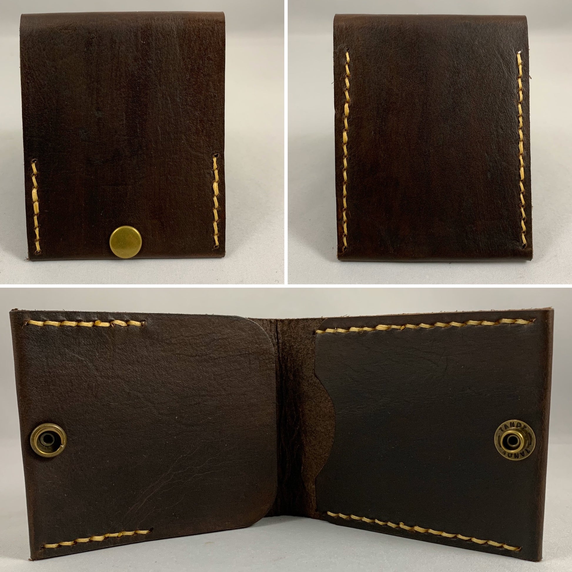 Leather veg-tanned simple wallet with a snap closer. Made to hold money in a simple flap and ID card or Credit card in another simple pocket.