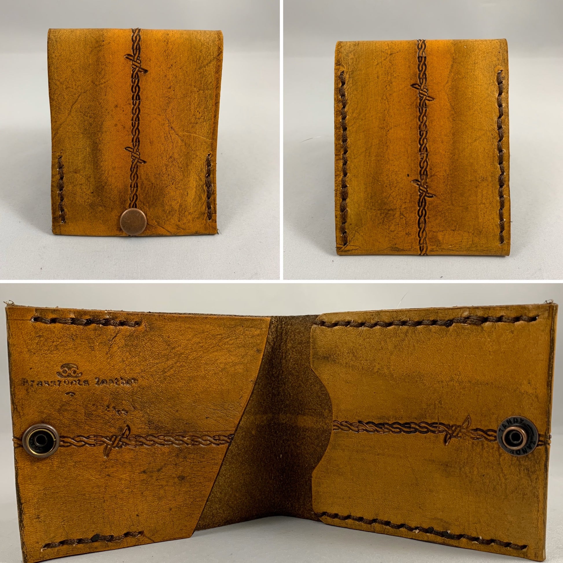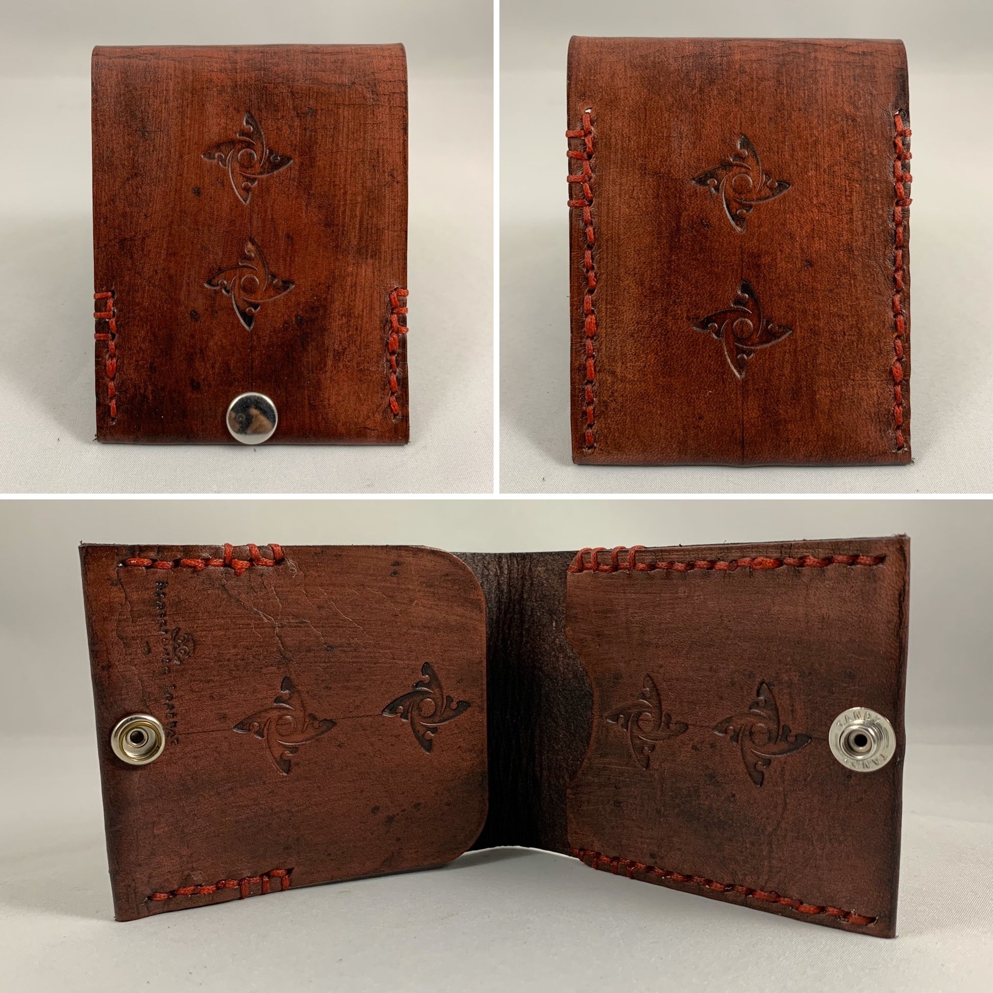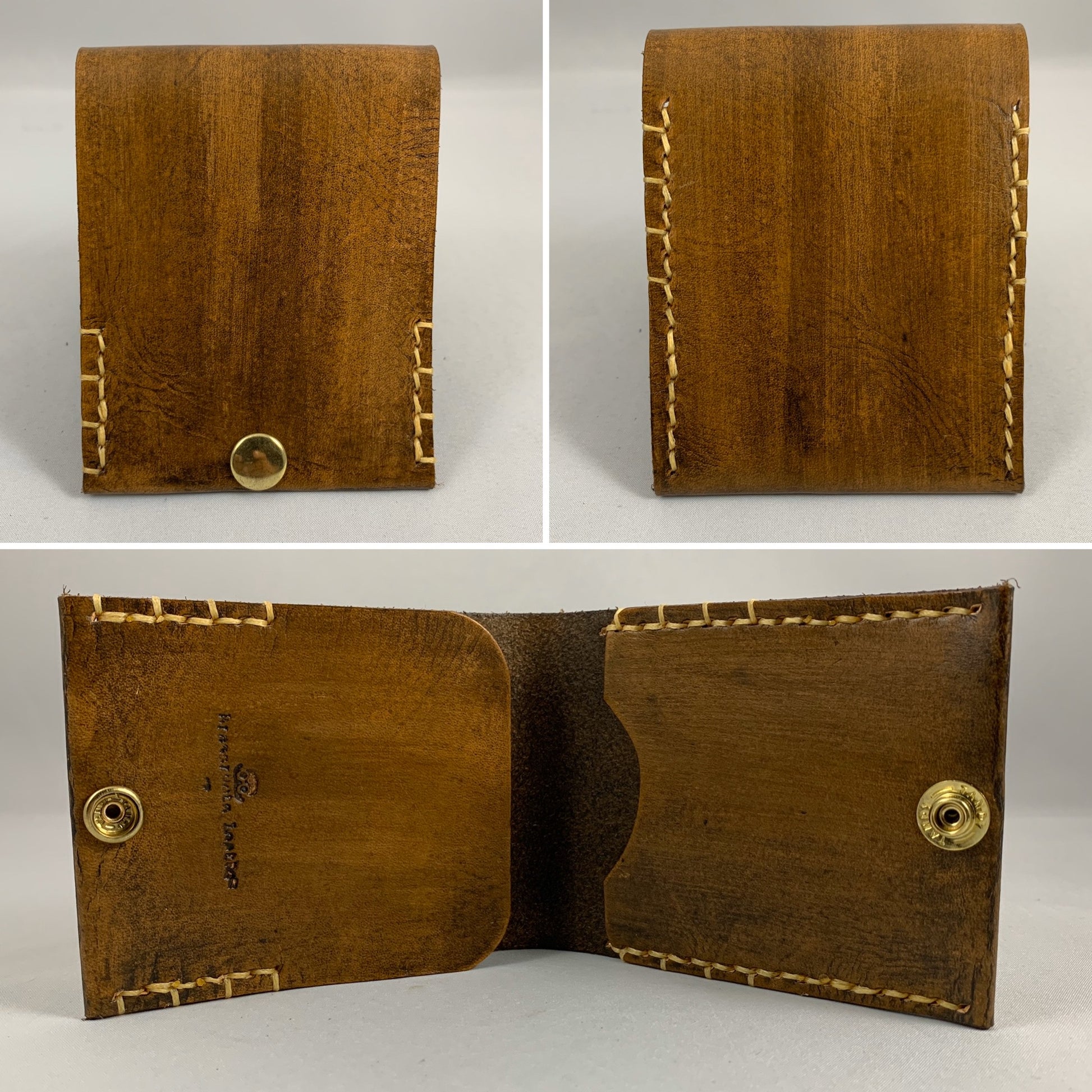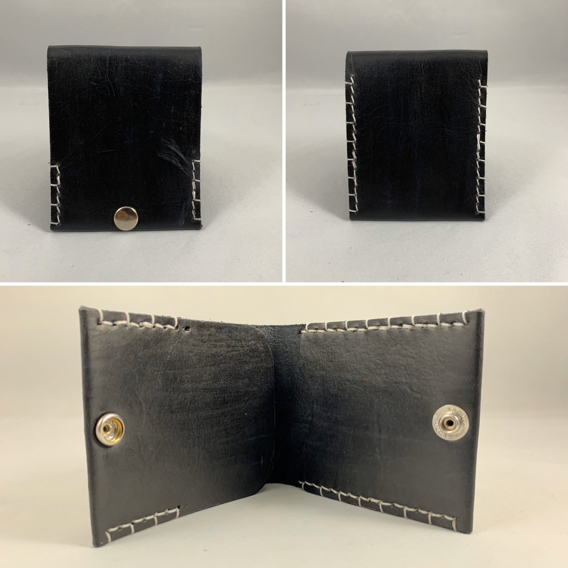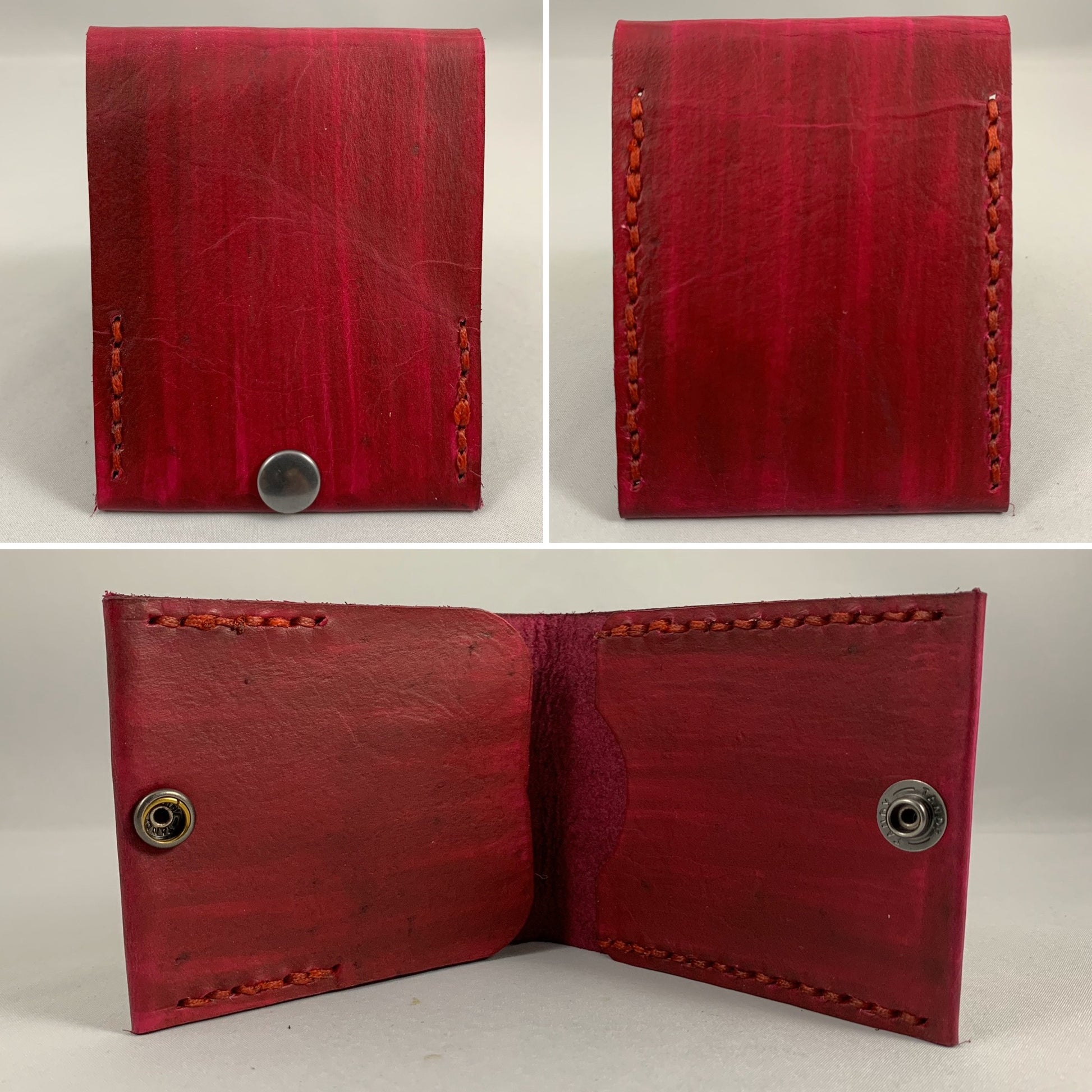 Leather veg-tanned simple wallet with a snap closer. Made to hold money in a simple flap and ID card or Credit card in another simple pocket.